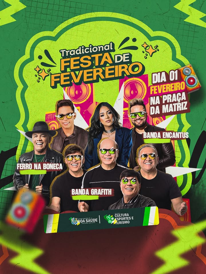 No dia 01 de fevereiro, a Praça da Matriz será palco de uma grande noite com Grafith, Banda Encantus e Ferro na Boneca, celebrando nossa cultura, nossa música e a alegria do nosso povo. 💚